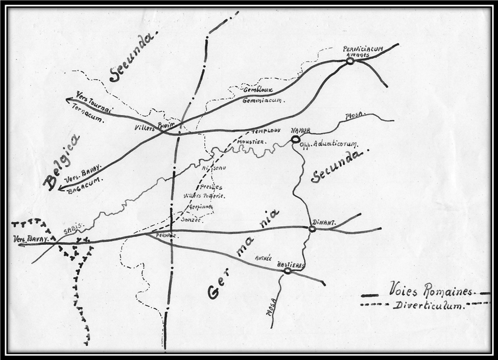 Cliché : DES005 Presles était traversée par un diverticulum reliant la grande chaussée romaine Bavay – Trêves à celle de Bavay – Tongres. Ce diverticulum passait à Berzée, Gerpinnes, Presles, Aiseau, Lambusart, Fleurus et Marbais. In : L’Indépendance, n° 51 – 2e année du 16-22 déc 1916