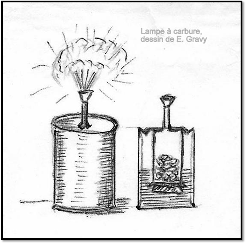 Lampe à carbureCliché : DES006 Lampe à carbure décrite par Maurice CHAPELLE (dessinée par Ernest GRAVY) dans « Pour s’éclairer à Presles durant la guerre 1914-1918 ». Coll. Eug. Gravy