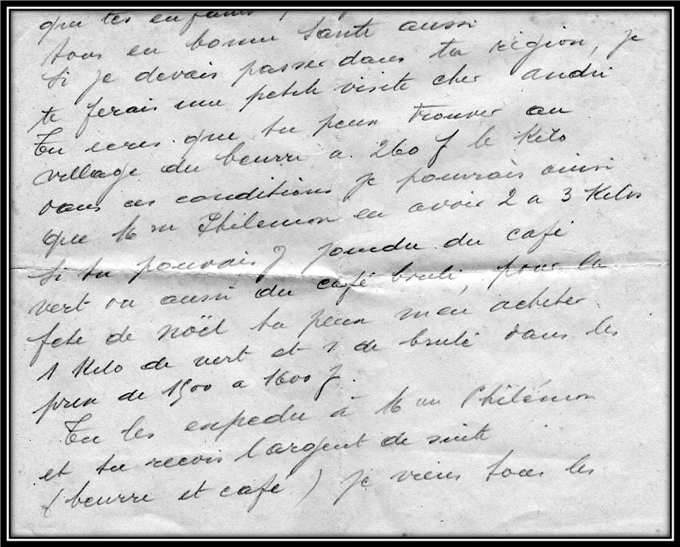 Cliché DIV021 Le « marché noir » durant la 2e Guerre mondiale. Extrait d’une lettre expédiée le 26/10/1943 : « … tu peux trouver au village du beurre à 260 f le kilo… pour la fête de Noël tu peux m’en acheter 1 kilo de vert (café) et 1 de brûlé (café torréfié) dans les prix de 1500 à 1600 f. Tu les expédies à Mme XXX et tu reçois l’argent de suite (beurre et café)… » Coll. M. JACQUY