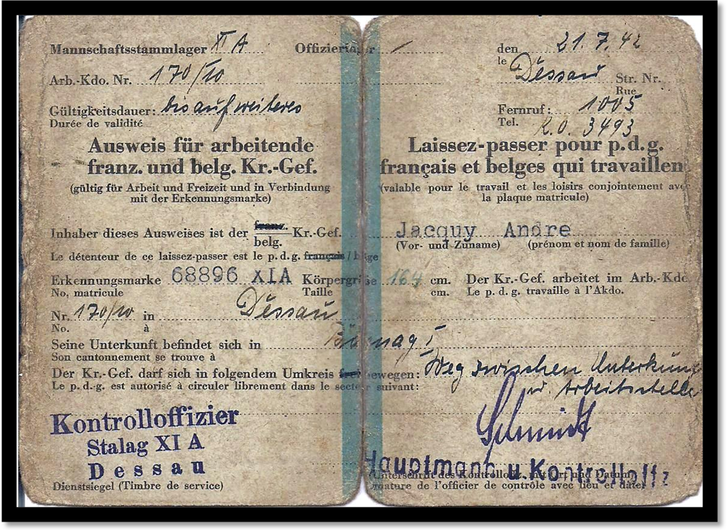 Cliché : DIV024 Ausweis (laissez-passer) Donné à André JACQUY qui était prisonnier au Stalag XI A à Dessau, de 1940 à 1943 Coll. M. JACQUY