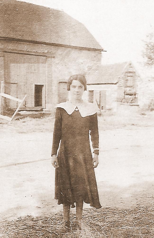 Simone AUBERT, en 1920 devant la grange de la Grande Cense du château (grange démolie en 1956) Coll. Eug. Gravy