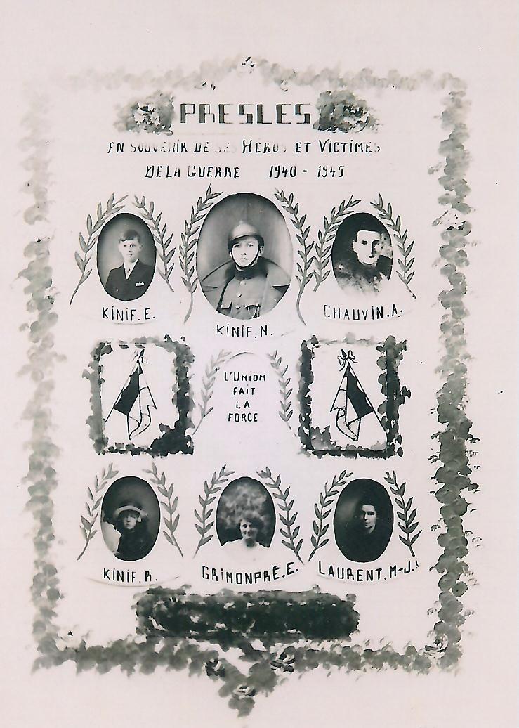 Cliché : DOC049Héros et Victimes de la Guerre 40-45. A. CHAUVIN et N. KINIF furent tués au combat. Les quatre autres sont des victimes civiles tuées lors de l’évacuation, suite au bombardement d’un train, et enterrées à Rouen. Coll. G. Grenier