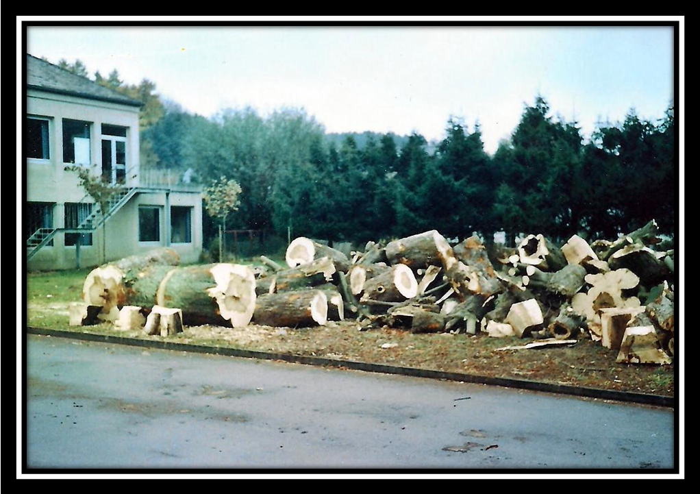 Abattage Vu leur dangerosité et la proximité de l’école Saint-Joseph, il fallut se résoudre à abattre les 9 marronniers des Prés Burnaux en 2003 Coll. Patrimoine preslois