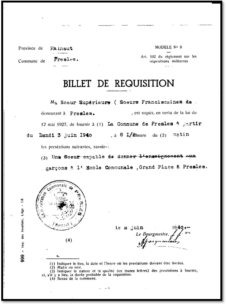 Cliché DOC069Billet de réquisition En l’absence de M. MICHOTTE, Sœur Marguerite-Marie (Valérie LIBERT) assura les cours de l’École Communale de Presles en juin 1940. Coll. Patrimoine Preslois