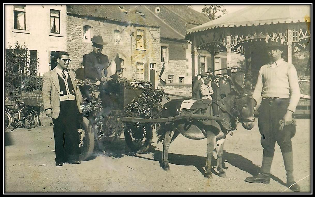 Li Baudèt da Thibaut – Dans les années ‘50, Albert Thibaut, Preslois un rien original, parcourait le village et les environs toujours accompagné de son âne et son attelage. Nous le voyons (ici à gauche) un jour de fête à Presles. Les années ont passé, mais qui ne se souvient pas du « baudet da Thibaut ». Ndlr. Nous serions heureux de connaître l’identité des deux compères accompagnant Albert. Coll. R. Henin