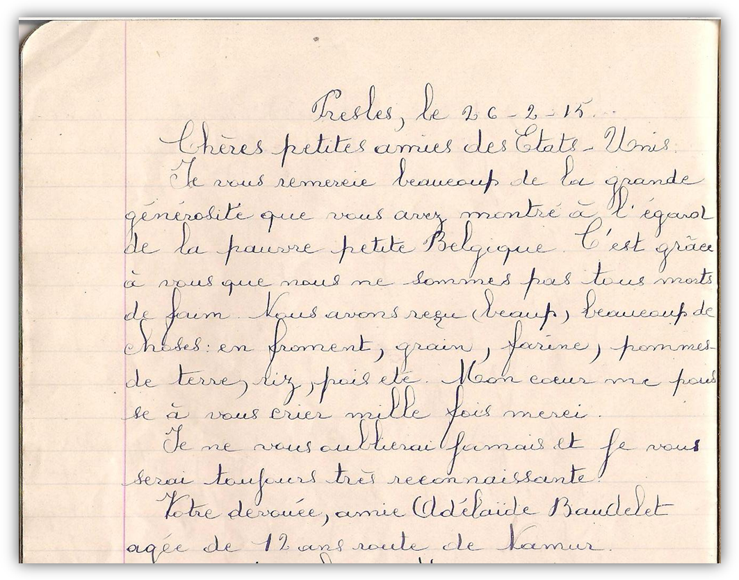 American Commission for Relief in Belgium Dès fin 1914, la famine menace la population belge occupée. Heureusement nos compatriotes purent compter sur la générosité du peuple américain. Reproduction d’une lettre virtuelle écrite par Adélaïde Baudelet dans son cahier de rédaction de lettres. Coll. R. Henin