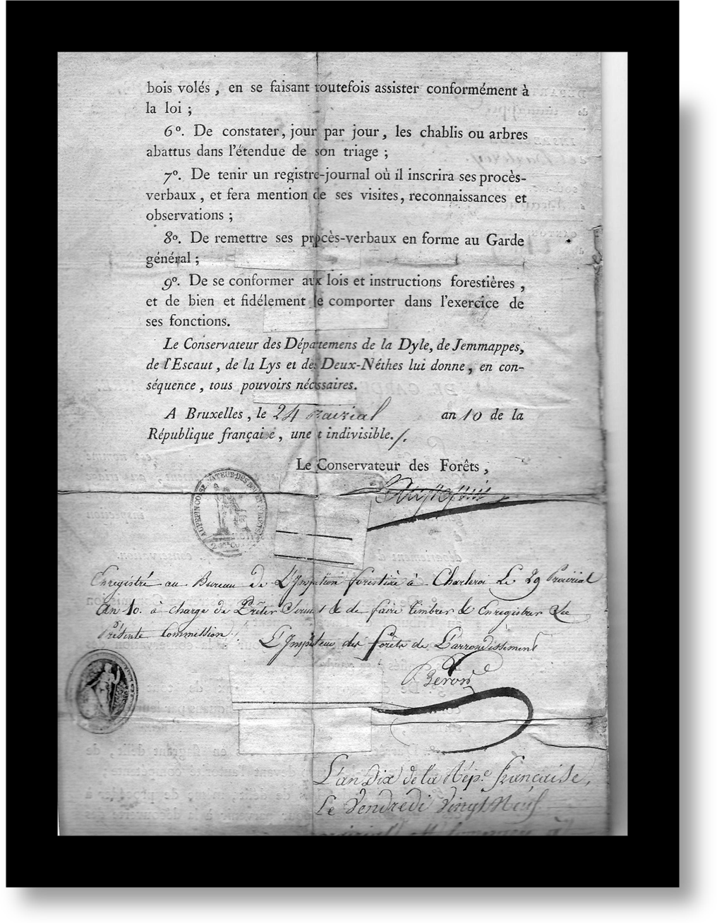 (suite) À Bruxelles, le 24 Prairial an 10 de la République française, une et indivisible "Enregistré au Bureau de l’Inspection forestière à Charleroi le 29 Prairial An 10 à charge de prêter serment et de faire timbrer et enregistrer la présente commission" s/ L’Inspecteur des forêts de l’arrondissement. Coll. Victor Gravy Ndlr. 29 Prairial An X, soit le 18 juin 1802