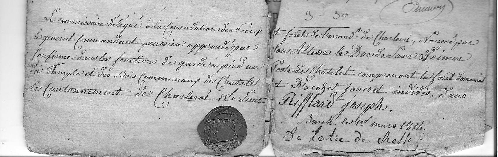 À lire au bas de la 3e page du document, l’apostille transcrite ci-après : « Le commissaire délégué à la conservation des eaux et forêts de l’arrondissement de Charleroi, nommé par le général commandant prussien approuvé par son Altesse le Duc de Saxe Weimar confirme dans les fonctions de garde à pied au poste de Chatelet comprenant la forêt domaniale du Temple et des Bois Communaux de Châtelet et d’Acoz et Joncret indivis, dans le cantonnement de Charleroi, le Sieur Rifflard Joseph. Binch (sic) le 1er mars 1814 » s/… Coll. Victor Gravy