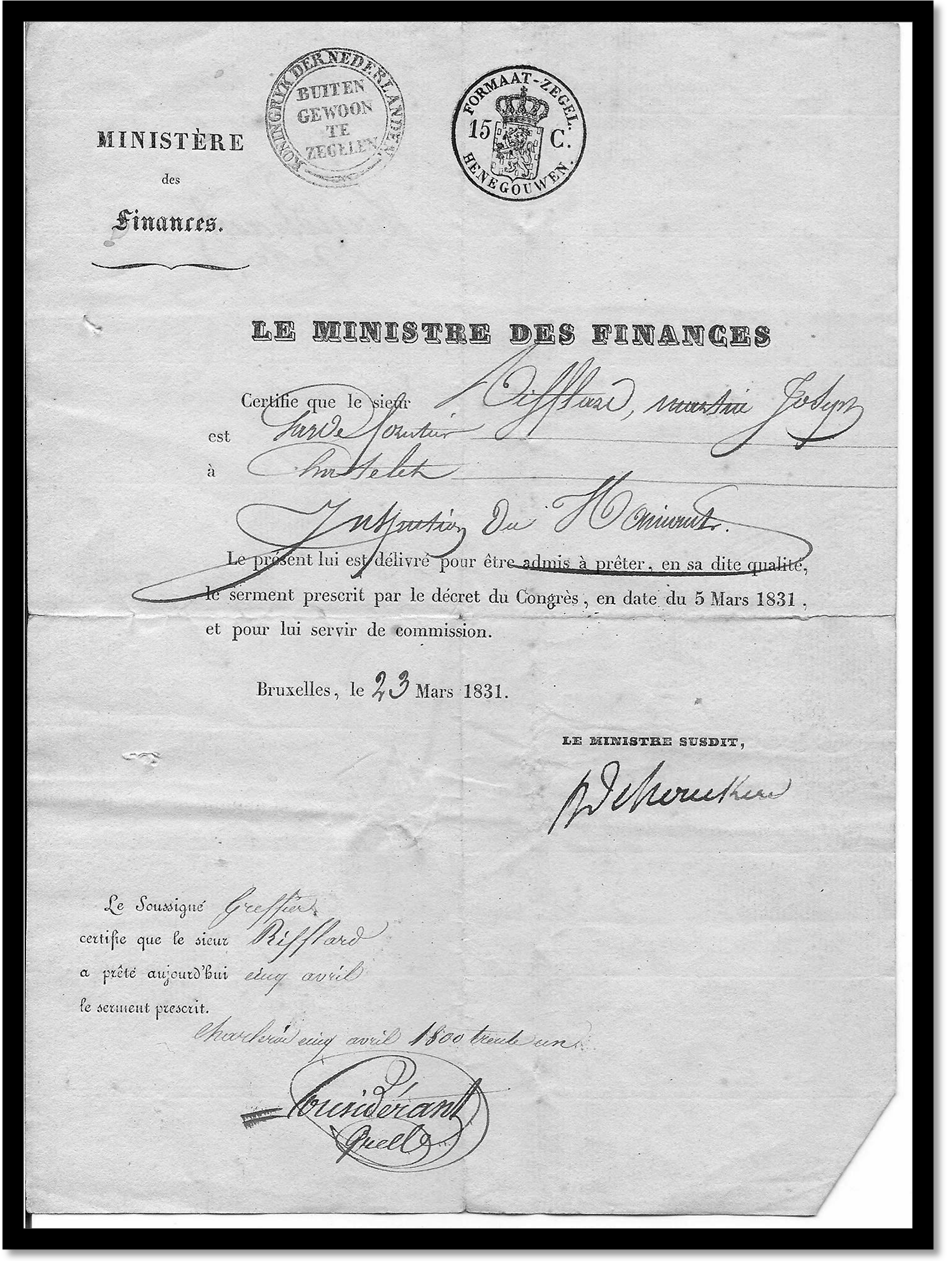 Cliché DOC079aDocument délivré le 23 mai 1831 par le Ministère des Finances pour permettre à Martin Joseph RIFFLARD de prêter serment en tant que garde forestier à Châtelet. Coll. Victor Gravy