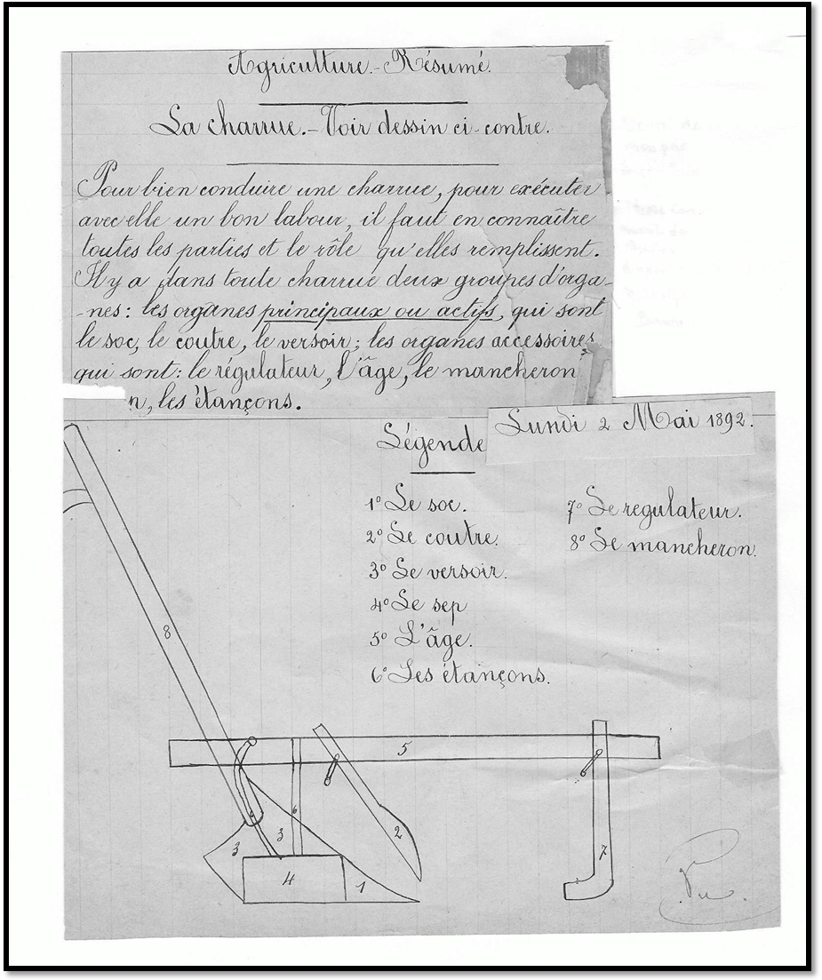 Cliché : DOC104La charrue Description et utilisation Cours fait par Joseph BANCU, instituteur à l’Ecole Communale de Presles en 1892 Devoir d’Eugène GRAVY, grand-père de notre président. Coll. Eug. GRAVY