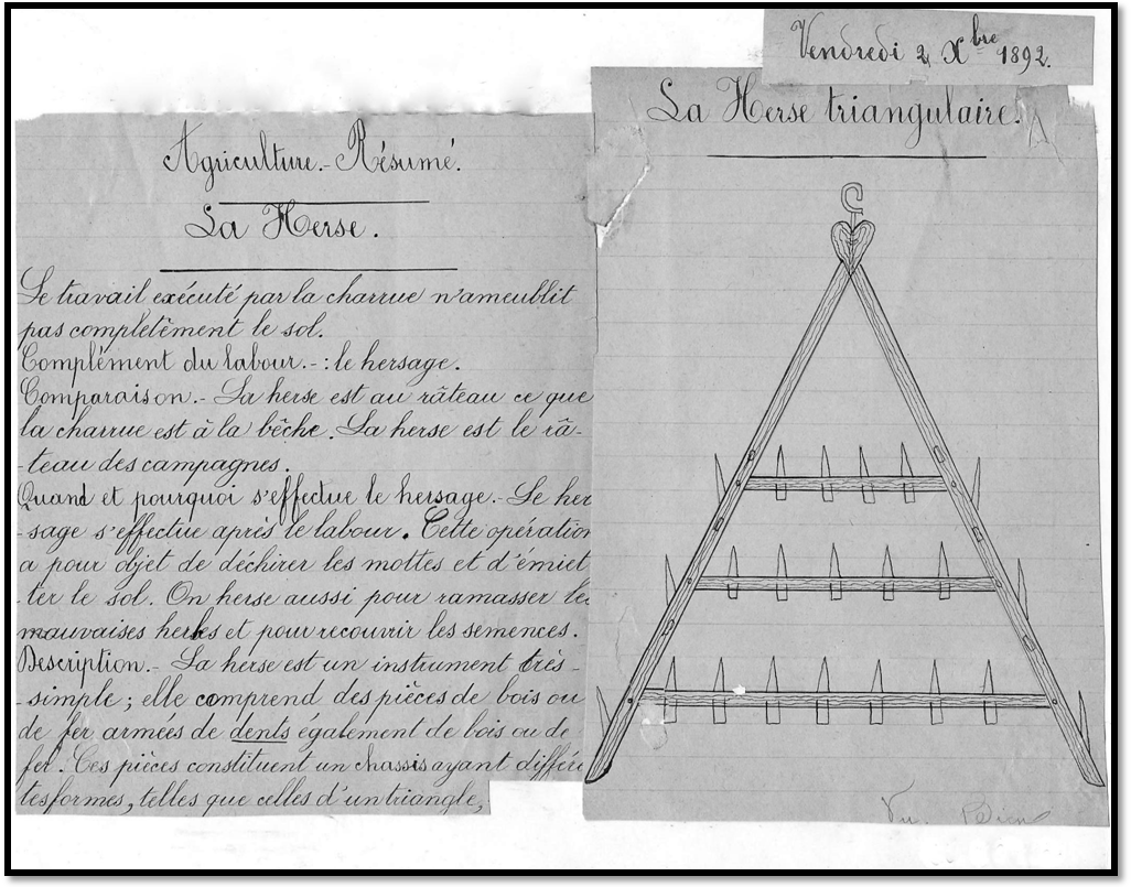 Cliché : DOC105La herse Description et utilisation Cours fait par J. Bancu, instituteur à l’école communale de Presles en 1892. Devoir d’Eugène Gravy, grand-père de notre président. Coll. Eug. GRAVY