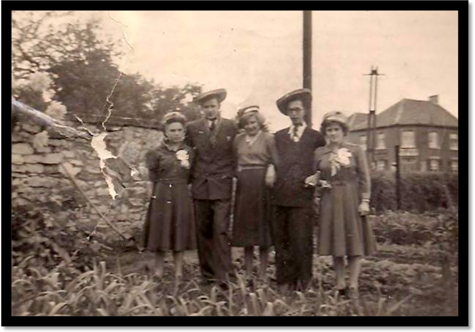 Lors de la Fête de Presles en 1950 Deux « chefs de jeunesse » bien encadrés. De gauche à droite Melle Blanche DEMOULIN, future Mme Marcel BIRON, à côté. Au centre Melle Suzanne SOL. Le second couple : Armand GUYAUX et sa fiancée Melle Renée JACQUY. La photo a été prise dans le tournant de la rue des Wespes, avec en arrière-plan, le café-épicerie et fermette de M. et Mme Raymond ANCIAUX et Madeleine MARY. À noter que le prénom officiel de Mme Anciaux était Lucile, mais que tous les Preslois l’appelaient Madeleine… Coll. Marcel Biron