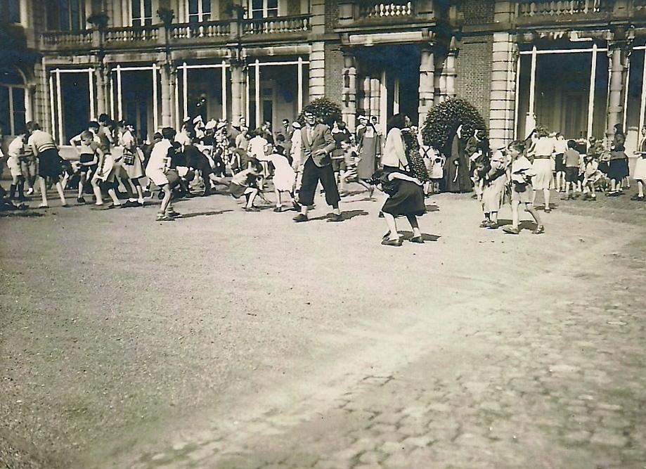 Baptème du comte J. G. d’Oultremont en 1950 Les enfants, à l’avant-plan et selon la tradition, se disputent les pièces de monnaie jetées à leur intention par les parrain et marraine. Coll. G. Hoebrechts