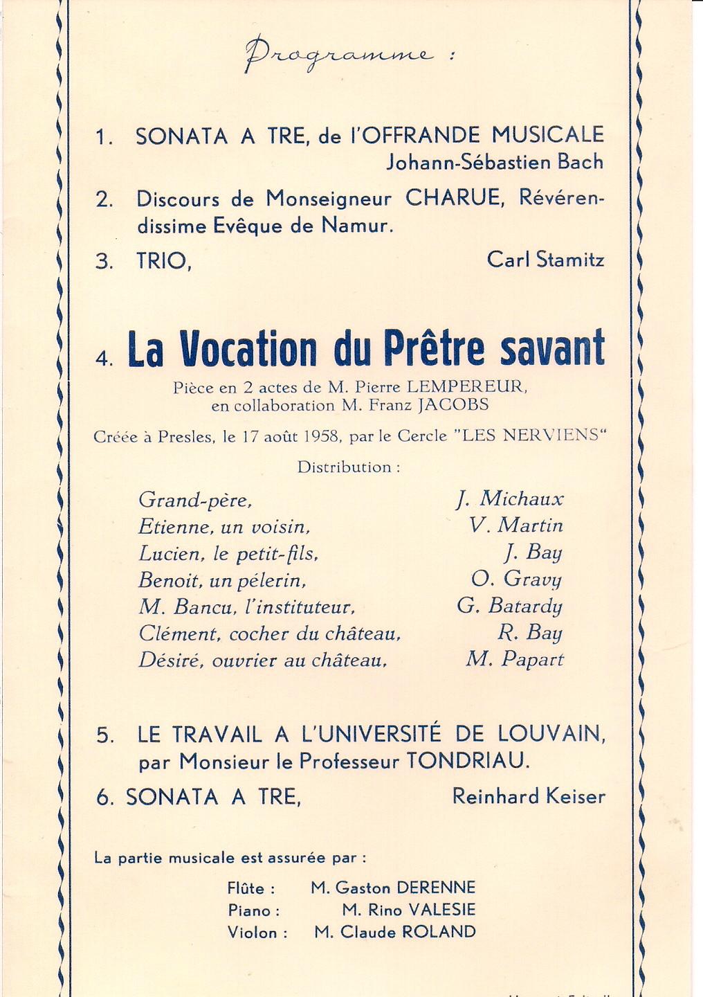 Cliché : EVE012Programme de la séance académique du cinquantième anniversaire de l’ordination de Mgr CERFAUX Coll. Chr. Zicot