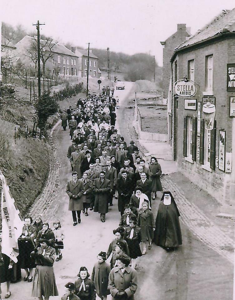 Cliché EVE027Cliché : EVE027 Cortège à l’occasion des prémices de l’abbé ÉLOY (1956). La rue des Wespes, à cette époque, et, dans le fond de l’image, des maisons expropriées pour être démolies lors des travaux de 1972. Coll. R. Henin