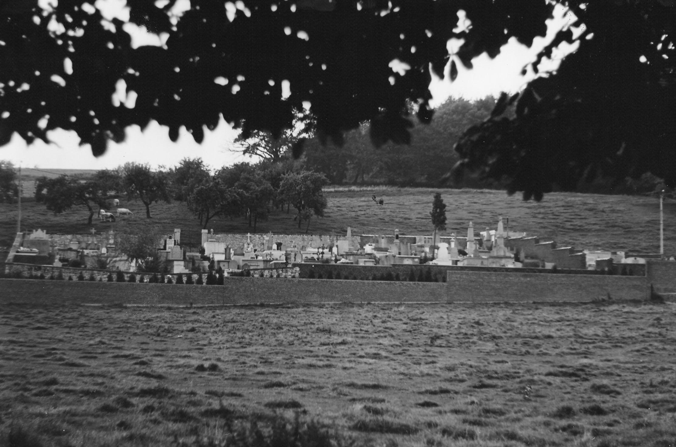 Presles : le cimetère communal, vu des Prés Burnaux. A l’avant-plan, les marronniers. Coll. Eug. Gravy
