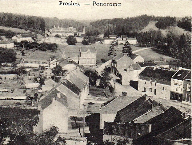 Panorama de Presles A remarquer : 1. La ferme MOUREAU-JACQUEMAIN – Maison communale – Étains des Presles – Centre culturel 2. École communale 3. Les Prés Burnaux 4. Église et château 5. Cimetière rue Haute Coll. R. Henin