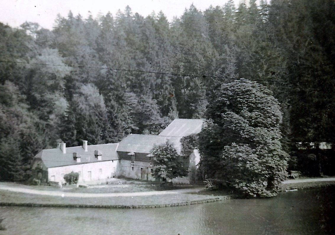 Le moulin dans le parc du château. Le toit, à l'arrière-plan, est celui de la scierie qui fonctionna quelques années et fut détruite par un incendie un peu avant 1950. Coll. G. Hoebrechts