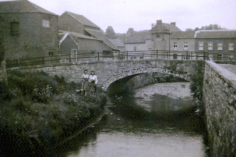 Photo de 1948 Pont de la Rochelle sur la Biesme, datant de 1839. A l’arrière du pont, à gauche, les dépendances de la ferme Jacquemain, actuellement le Centre Culturel d’Aiseau-Presles. Coll. R. Henin