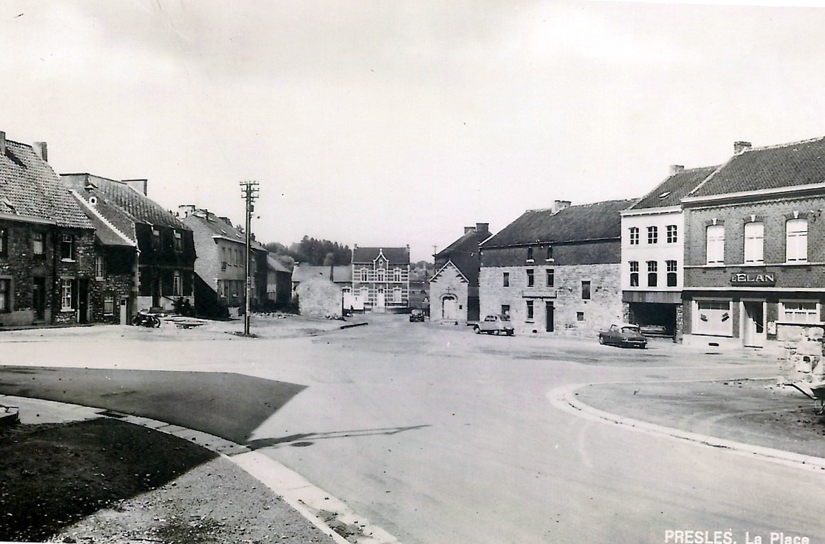 La Place Communale de Presles vers 1960. Le bâtiment situé entre la 2CV et la DS Citroën était à cette époque la Maison Communale de Presles. Edit. Magasin Mesdagh à Presles