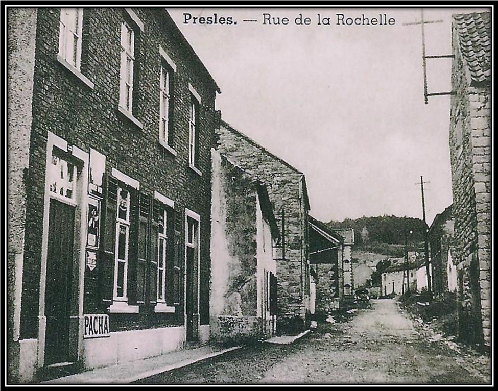 La rue de la Rochelle jusqu’en 1950. À l’avant-plan, l’épicerie « Chez Adonis ». Coll. Ed. Multiphoto, Flawinne