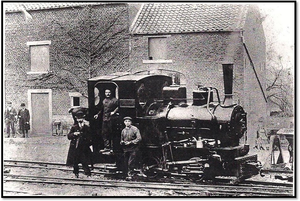 Construction de la ligne du tram vicinal Fosses-Châtelet. Petite locomotive à vapeur qui servait à tracter les wagons de marchandises transportant les matériaux nécessaires à la construction de la ligne vicinale. À l’arrière-plan, la maison de Jean-Baptiste Cerfaux, père de Mgr Lucien Cerfaux Coll. Eug. Gravy