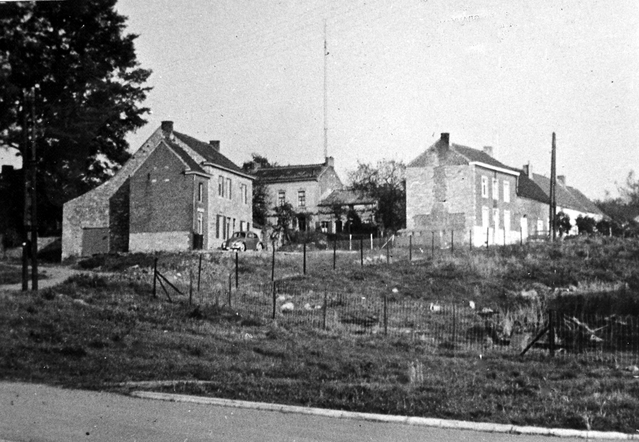 Li carière Djaquèt à l’avant-plan, comblée, devant les maisons des frères Mainjot-Pouleur. Dans le fond, l’ancienne maison F. Boccart-Gilles, ensuite occupée par la famille de Félix Cavier, garde-champêtre. – 1970 – rue du Bordinois Coll. Eug. Gravy
